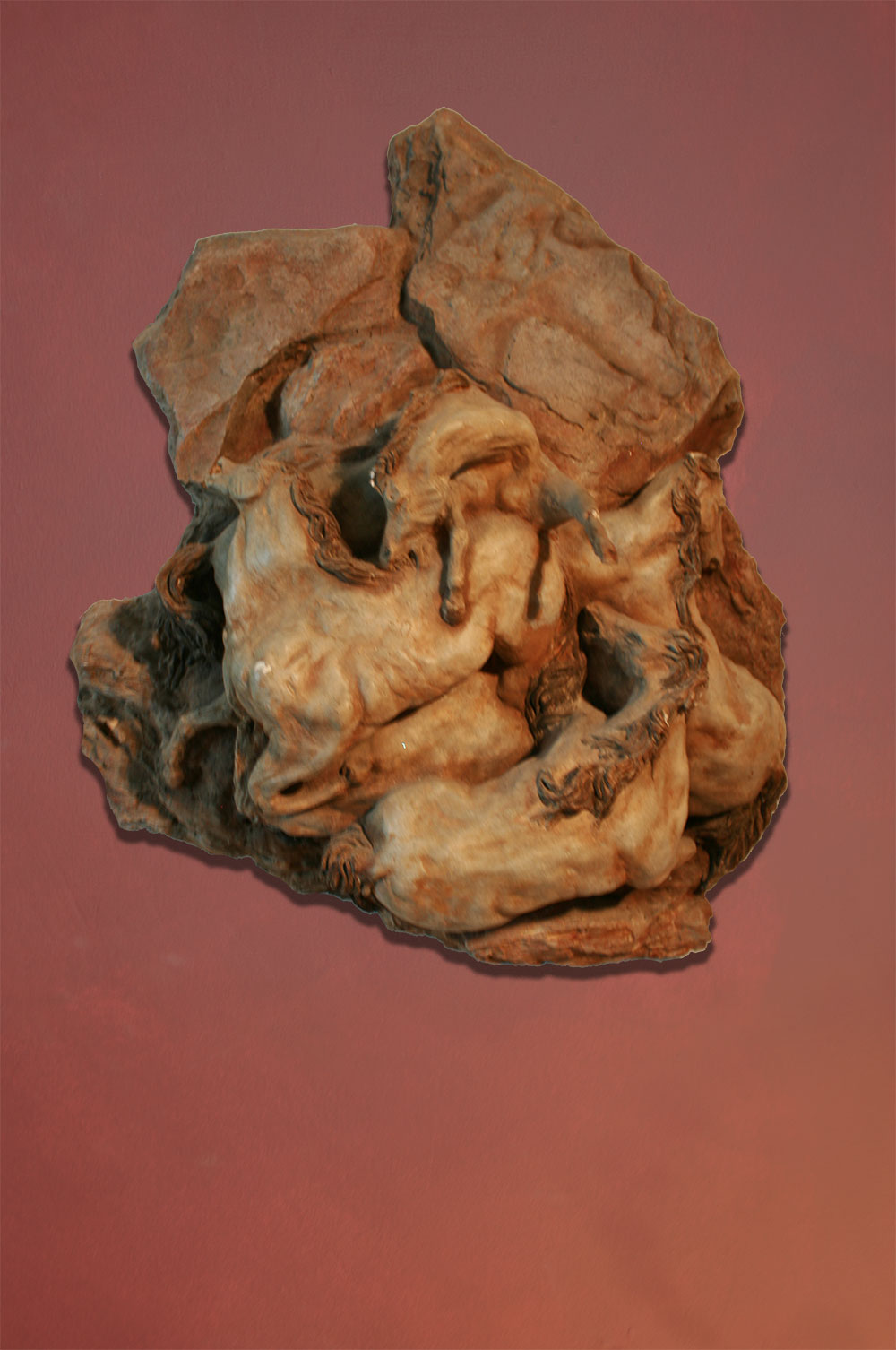 I was tiredly thinking of how to go about this. I definitely wanted horses with their strong force and strength. I wanted a battle. Then one day while walking through the LA Museum I came upon a small sculpture on a four foot white roman pillar. The sculpture was a round relief sculpture you could walk around. This was 2 feet in diameter.These were horses battling each other with no men on their backs. This was not a battle of men.This was a battle of horses with their strength and force battling each other made in white marble. I absorbed every detail for hours. They were battling each other furiously. I loved what I felt. There was only one other sculpture in the same room that shared this small room. This was a larger than life sculpture in the corner. This was a bronze sculpture of Lucifer who embodied this whole corner section of the room looking down on the Horses that are battling each other.I’m wondering if the curator did this on purpose. The horses are called The Battle of Armageddon. I’m looking for inspiration today. Well I certainly noticed this positioning of Lucifer looking down on The battle of Armageddon. I could not walk away from this battle. I was looking for inspiration today to express to my friend Gladys that perhaps I could explain to her my understanding of this lengthy story and here lies a sculpture of many horses battling,capturing the forces and representing the will of man.